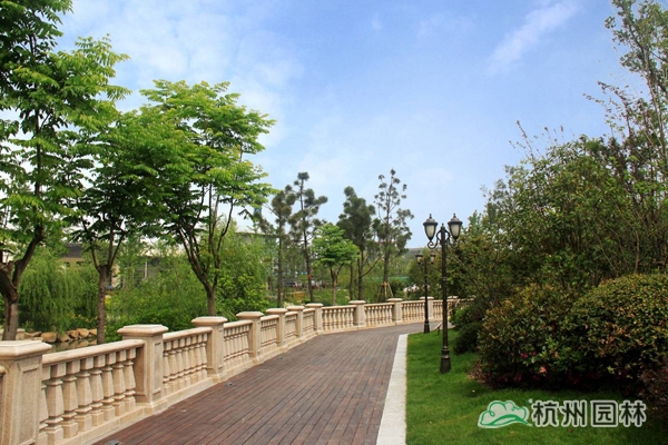 该工程位于杭州城北石祥路与蔡马河交汇处,为大型综合性园林景观工程,内容包括园林建筑、苗木种植、硬质铺装、叠石跌水、景观小品、土坡造型等。该项目景观全方位采用规则式与自然式融合的维多利亚园林风格,如梦似幻,华贵雍容,将维多利亚皇家园林景观特征表现得淋漓尽致。