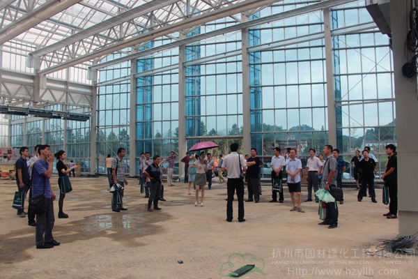 厂商代表参观正在建设中的青山湖•花园中心玻璃温室大棚