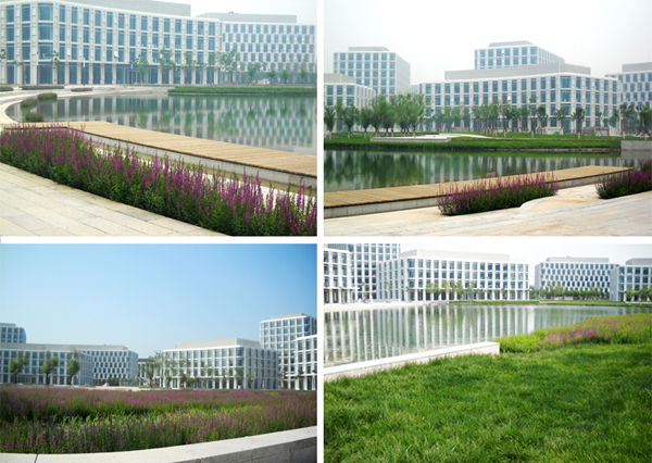 本工程是大型商务园配套景观绿化工程,整个项目以人工湖为中心将建筑呈环形布置,分为内环、中环、外环。绿化围绕建筑均匀有层次的分布,环路两侧栽植国槐;办公楼之间则种植日本晚樱、碧桃、海棠等观花、观叶类乔木,以及黄杨、女贞等灌木和绿篱;中心湖区域两侧的能源半岛和湿地半岛上被喜水性植物覆盖,起到净化湖水的作用,岸边种植垂柳,开辟休闲区域;园路铺装材料选用水洗石、花岗岩,石汀、铺装与绿地自然衔接;再加上花坛和景观小品,各种观赏性植物互相衬托,乔木与灌木合理搭配,使得景观与建筑、环境完美结合。