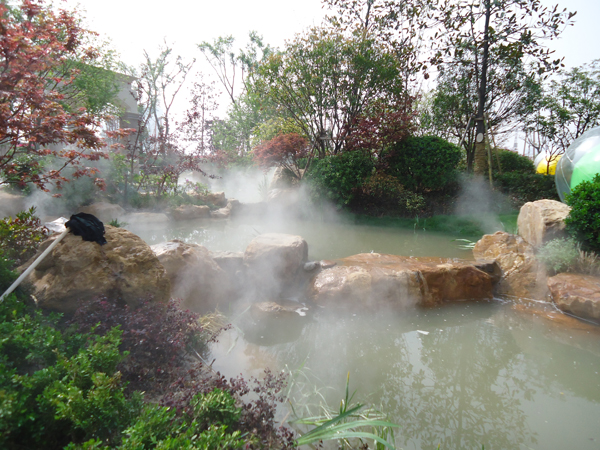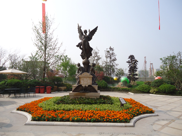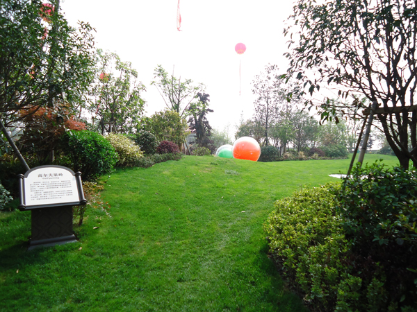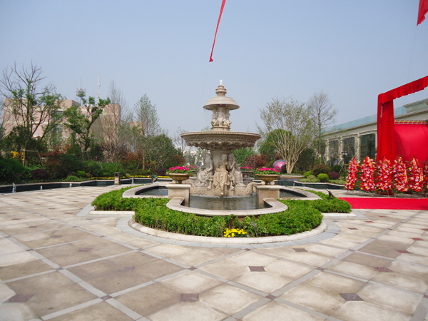 更引人注目的,还有销售展示中心前面的雕塑喷泉,该喷泉运用花岗岩整石雕刻拼接而成,工艺极其复杂,自上而下不断洒落的水花,营造出一片清凉;无以复加的镂空铁艺圆顶繁复花纹和拱门的石材立面装饰的皇家景观亭,精致中透露出大气;潺潺溪流、雾气缭绕的人工溪涧,如梦似幻;大面积的高尔夫果岭草坪蜿蜒起伏,华贵雍容……