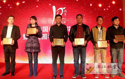 大会揭晓并颁发了“突出贡献奖”、“贡献奖”、“最佳合作伙伴奖”、“2013年优秀参展奖”、“2013年产品金奖”等多个奖项,以此表彰一批多年来为中国(萧山)花木节的成功举办做出积极贡献的个人和单位。其中,杭州市园林绿化工程有限公司荣获“最佳合作伙伴奖”、“2013年优秀参展奖”,参展的产品“红宝石”紫薇和“火炼金丹”桂花荣获“2013年优秀产品奖”,总经理张炎良上台领取了奖牌。