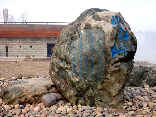 在临近东门口广场的地方,竖立着一块高4米的整石无字碑,粗糙的碑身上下没有一个文字,只有镌刻的一行阿拉伯数字“2012.7.23”,以及记录洪水水位高度的标刻。“碑身的顶部伏有一只惟妙惟肖的犀牛,取名为‘犀牛镇河妖’,现在犀牛还没做上去。”李寿仁说,“这块无字石碑是让泸州人民永远铭记着2012年7月23日,洪灾肆虐酒城,洪水水位达到泸州历史最高水位的日子。”一块无字碑,胜过千言万语的表述,却让人们铭记一段历史。作为无字碑的原创者,李寿仁希望借此表达酒城人民希望今后洪水不再肆虐、家人永远平安的祈盼。再仔细观察才发现,这块石碑的四个角、四个面的处理方式和纹路都各不相同。看似无字,实则意蕴深远,如此创意,让人暗暗称妙。