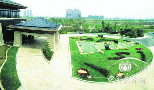 如2号楼大厅门前,在大面积草坪上,选用红花檵木、金边胡颓子、茶梅等一些小毛球,用中国书法的用笔法则,十分简洁地“书写”出点、横、竖、钩、提、撇、短撇、捺,即代表中国书法中笔画大体的“永”字八法,这种匠心独运的植物配置,将园林造景手法与中国书法艺术完美配合,在园林景观中融入了中国深厚的文化底蕴,景观效果令人耳目一新,使酒店整体景观品位得到提升,是中国传统园林造景手法的典型运用。