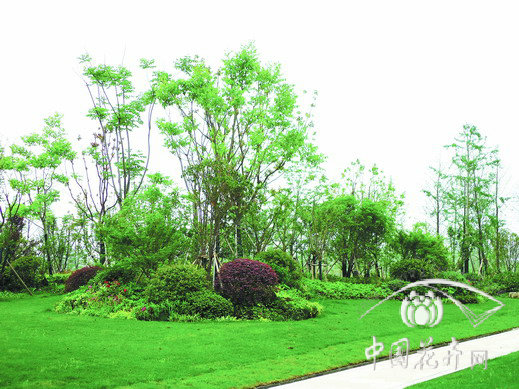 在1号楼和2号楼之间,植物配置讲究层次错落有致、季相色彩丰富多变、天际线分明起伏、林缘线和草坪线视觉流畅,遵循大自然本身的多样性、群落性、生态性原则,营造出对比强烈、富有节奏和韵律感的园林景观。其中,高层主要用榔榆、香樟、榉树、落羽杉,中层用桂花、红枫、鸡爪槭、白玉兰,低层用红梅、石楠、红花檵木等,在有限的空间里,营造出变化多端的园林景致,特别是大规格造型植物的应用,更是起到了画龙点睛的作用。