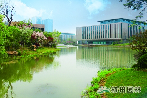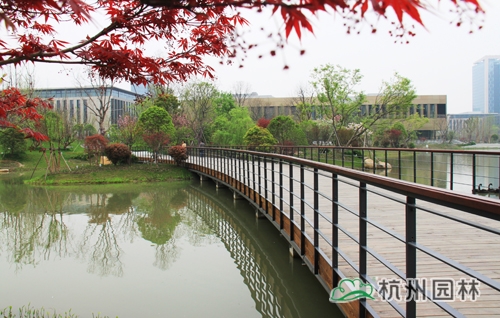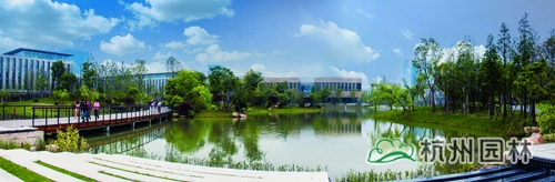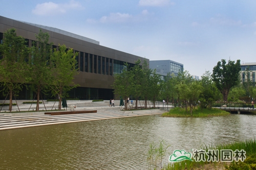 从滨江区江虹路的西入口处走进华为杭州生产基地,首先映入眼帘的是广场上大小不一的花池,一棵棵银杏、香樟、桂花生长得郁郁葱葱,昭示着无限的生机与活力。脚下的铺装,一边是菠萝格防腐木,一边是规则的花岗岩,一“软”一“硬”,相映成趣,蜿蜒延伸,直通前方的人工湖。清澈的湖水,在夏日阳光的照耀下,波光粼粼,偶尔一阵风来,一圈圈的涟漪荡漾,整个湖面都动了起来,让人忍不住加快脚步,去一睹前方的美景。这就是华为杭州二期生产基地景观绿化分包工程一标段的现场景观,该工程由时搏在线开户承建,曾荣获2013年度浙江省园林绿化工程安全文明施工标化工地。
