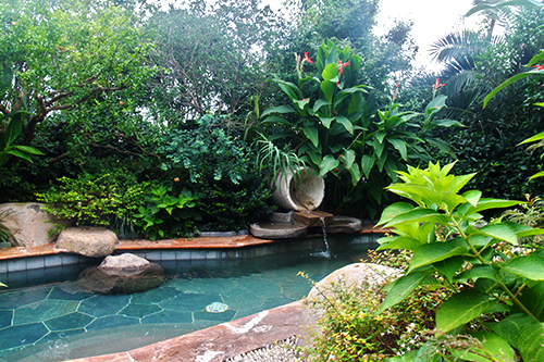 露天泳池热带风情,温泉泡池仿若天成。露天泳池区景观独具特色,选用华棕、棕榈、布迪椰子、加拿利海枣等热带植物作为主景,营造出简约大方、层次分明的浓郁热带园林风情。为了提高这些热带植物的成活率,降低后期的养护成本,这批植物都经过驯化,较能适应吴江的气候条件。该区面积较大,从酒店的观景平台上往下看,泳池中间的小岛就像弯弯的小船,仿佛要顺流而下;水质清澈见底,水底大面积的蓝色和黄色玻璃马赛克,营造出波光鳞鳞的效果,流动的线条瞬间充满了生机和活力,整个泳池仿佛都动了起来。