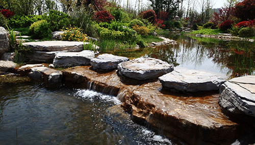 其中,人工湖面积7000平方米,小而精致,可谓是整个公园的“点睛之笔”。由亲水平台区,源头区,中心湖面区,邻水生态区,桥梁区构成。湖面区域贯穿整个工程,没有自然条件的衬托,完全由人工园林造景手法完成,在邻水景观带种植睡莲、荷花、再力花、千屈菜、鸢尾、芦苇等水生植物,营造生态岸线,同时选择其他亲水植物,如美人蕉、碧桃、杨柳、水杉作为过渡和背景,虚实结合,营造出多方位的景观效果。湖面虽小,但结构完整,假山叠水,拱桥,原石临水桥,湖边卵石生态群落一应俱全。其中,景石主要使用了安徽的灵璧景石,约7000吨,堆叠出水源、暗桥、亲水沿岸等景观。