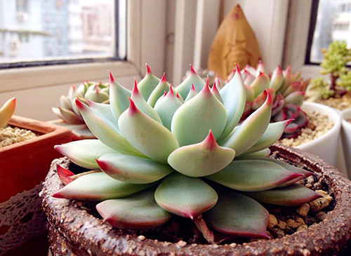 1、光照:尽量选择光照时间最长的地方来放置多肉植物。如果光照不足,不要轻易的把多肉植物搬到户外哦!但是,夏季要小心高温、长时间的曝晒,因为多肉植物组织细胞肥厚,散热缓慢,非常容易造成叶片晒伤。其他季节充分日照有助于植株生长。