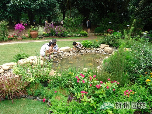 走进园内,蜿蜒的溪流和溪岸边的景致野趣妙生,一下子扑入视野,清澈的溪水、光滑的卵石、可爱的小蝌蚪,与岸边的银边菖蒲、水生鸢尾、花叶美人蕉、花叶芦竹等水生植物一起,营造出生态、自然的河流景观。“这条溪流,其实是我们杭州的母亲河——钱塘江的缩影,通过这条溪流的营造,我们想呼吁更多的人保护生态、爱护环境,让我们的母亲河永远干净、清澈。”郭昌如简短的话语中,透露出的是一名园林人渴望更多人关注水生态环境的殷殷期盼。