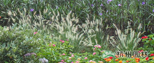人来人往的杭州火车东站西广场,草坪碧绿,树木葱郁,更有一座名为“西湖印象”的立体花坛吸引着众多游客的眼。而在广场通往天城路方向的一片草坪里,一处100平方米左右的花境小品却格外引人注目,红黄粉交相辉映的五色梅、叶秀花艳的香彩雀、紫色优雅的翠芦莉、飘逸秀气的小兔子狼尾草、青翠挺立的直立冬青、叶色嫩黄的黄金香柳……丰富的品种,艳丽的色彩,既展现出植物的色彩美,又营造出丰富的群落美,使得这处小花境成为这片风景的点晴之笔。
