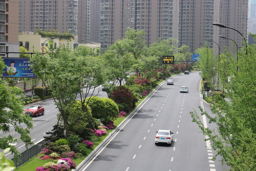 项目南起新业路,北至昙花庵路,全长约1750米,是集绿化、美化、文化等为一体的景观大道,四季特色分明。春有日本早樱、垂丝海棠等花满枝头;秋有银杏、红枫色彩明艳,更有桂花一路飘香;夏、冬时节风景又有不同。丰富的植物配置、色彩鲜艳的草花、文化气息浓郁的小品……使得这条道路开阔大气,充满生机。
