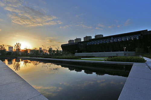 项目入口广场处的灵动喷泉、唯美浪漫的水上舞台、时装馆温馨自然的庭院、宛如飘带的户外连廊……园林与建筑有机融合,突出丝绸文化与特色,讲好流光溢彩的“丝绸故事”。