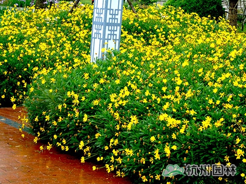 黄金菊花色金黄,在花境中色彩突出。其高度可达1.5m,可做花境背景材料、花境前景焦点材料,也可大片单独种植。