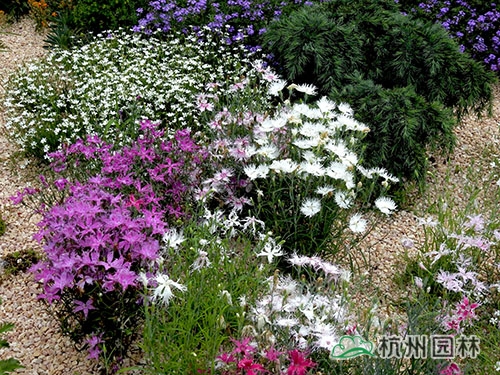 石竹品种多样、花色从白色、粉色、紫红色至红色均有,花瓣形态变化也较多,是花境中良好的中景至前景材料。