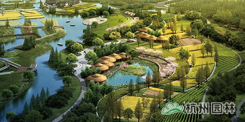 养生休闲主题区:对原有的生产景观保留改造,水稻田、葡萄园、油菜园、果园、苗圃以及可食用水生植物被布置其中,兼具经济与观赏价值,结合水庄、竹庭、有机菜园,酒庄等休闲景点,推广宣传现代都市农业。