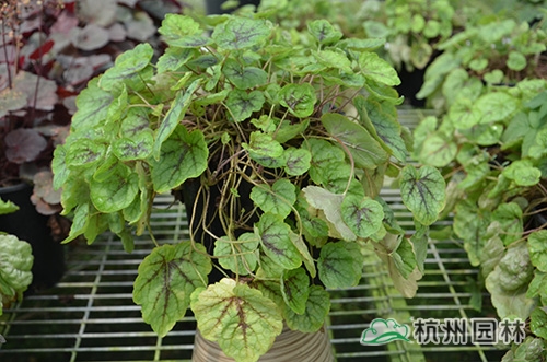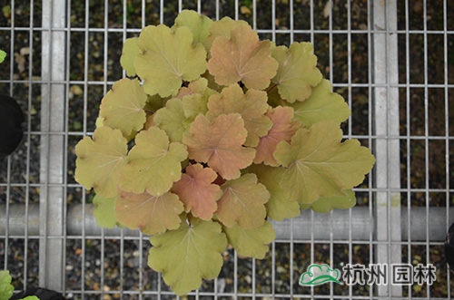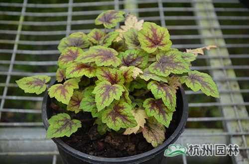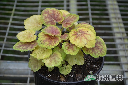 矾根叶形也变化多样,基部心形或楔形,掌状浅裂至深裂,边缘波状,浅根系,叶基生,花期一般为4~10月,花很小,呈钟状,两边对称。幼苗长势缓慢,成苗后生长旺盛。绿期长,能够在-15℃以上的温度下生长。具有喜半荫、耐全光、耐旱性和耐寒性强等生理特点。适宜富含腐殖质的土壤。喜中性偏酸,适宜的PH值为5.8~6.2,能够在倾斜地方生长。冬季不落叶,枝叶生长稠密,株型圆整,覆盖性强,花和叶都比较漂亮。