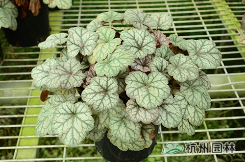 矾根又名小花肾形草,英文名为“Alum root”(因根部不规则膨胀而来),因此在引入中国的时候被翻译成了“矾根”。矾根叶色繁多,且叶色会随着季节、环境、温度和光照条件的变化而改变。例如,‘蜜桃黄’在春天的时候,叶子展现出细腻的银色光泽,成熟的叶片颜色会呈现紫色并略带玫瑰红;‘赤砂岩红’的叶色会从桃红色变为亮铜黄色,再变为绿色带有琥珀色;‘贵族紫’叶子的颜色会保持稳定的紫色,冬天的叶子会变成银色。
