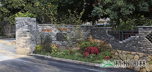 钱三组共有31户人家,以前,这里家家都是高墙大院,虽然每家的小楼都盖得很有特色,但却被高高的院墙挡住了院内的风光,而且整体绿化景观单一,缺乏本土特色和文化气息。如今,高高的围墙被拆除,改为以旧青砖为主,搭配铝合金栏杆,以老石板、旧瓦片、老石磨、老石鼓等作为点缀,怀旧物件与现代元素有机结合,营造出全新的集古朴与时尚于一体的敞开式景墙。在景墙内侧种植桂花、意大利络石等绿篱,墙外地面种植麦冬等常绿草本植物;在每家庭院入口两侧和一些节点处设置小花境,种植各类常绿、色叶、草花等植物,营造出风格多样的花境景观,在软化景墙生硬感的同时,景观更加丰富多变。