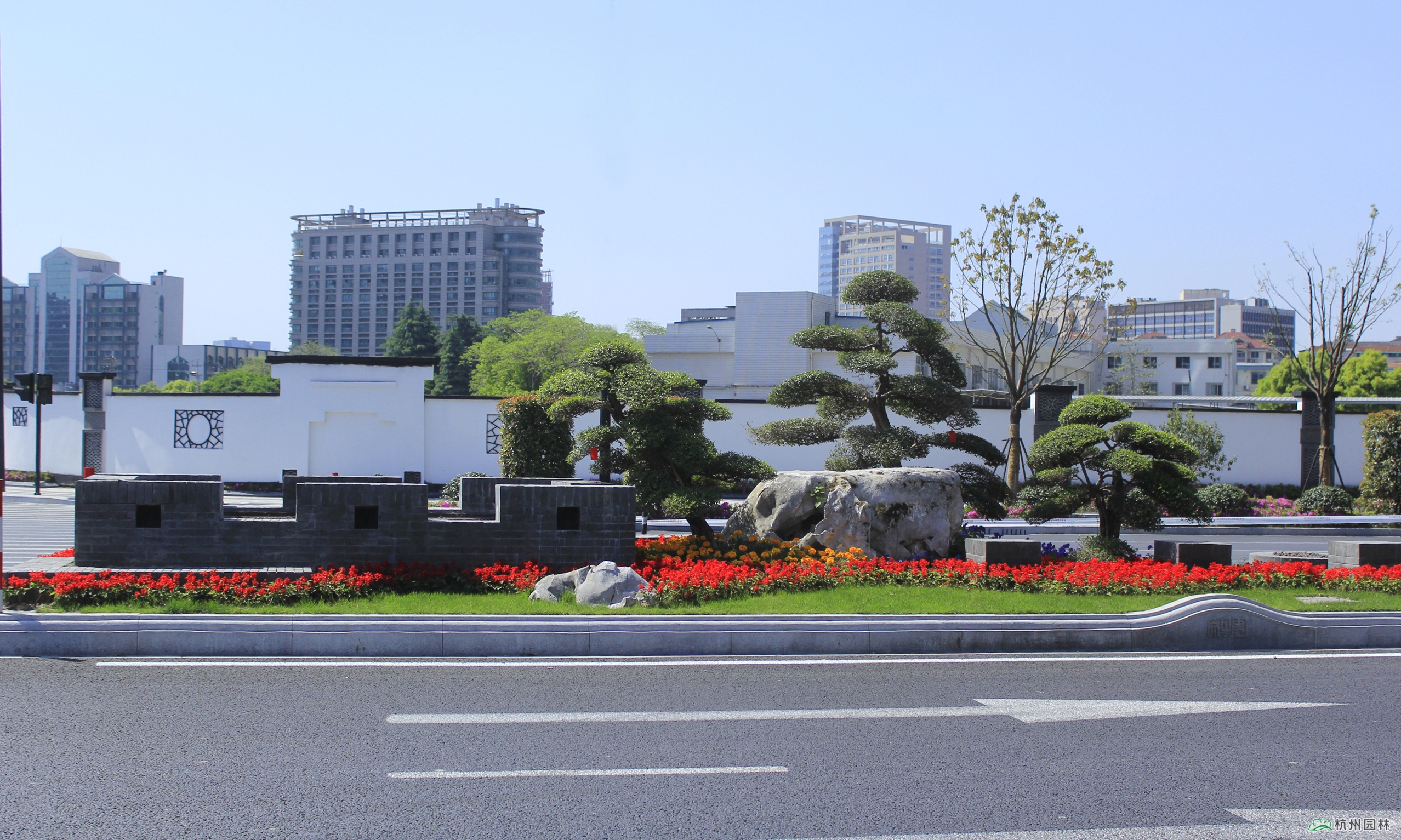 在道路十字路口及一些重要节点,则通过造型树、球类植物、景石等的有机结合,采用盆景化的造园手法,景观效果独具特色。从而使得新塘路成为四季常绿、三季彩叶、全年花开不断的“最美”迎宾大道。