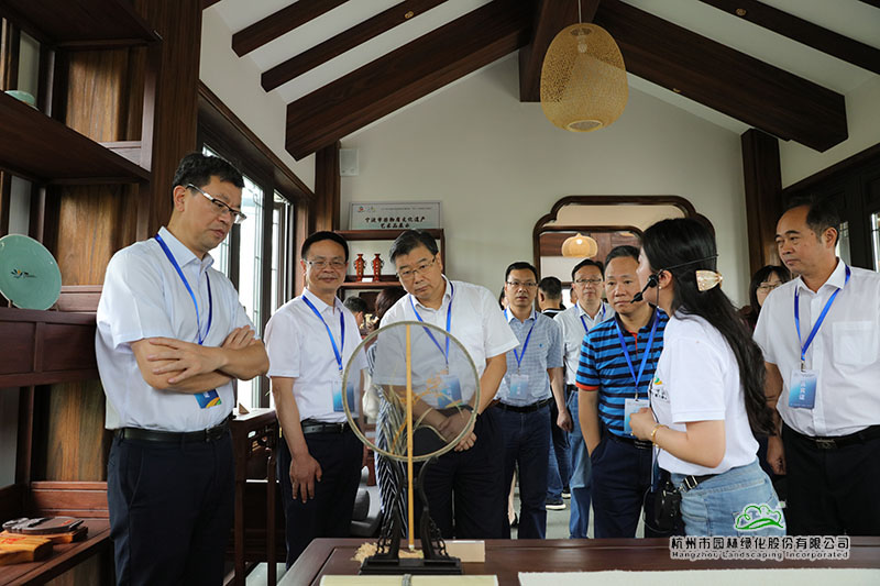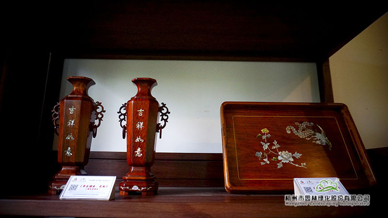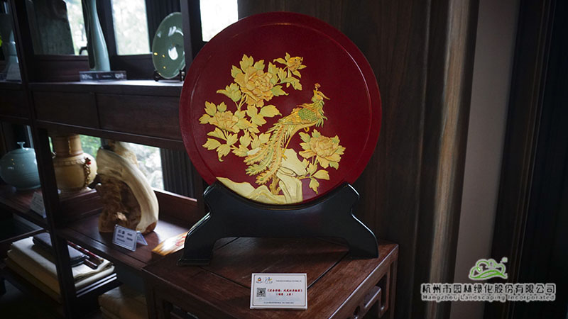 在浙江园的富春山居内,泥金彩漆、骨木镶嵌、金银彩绣等非遗展品也一并展出。泥金彩漆是宁波传统的“三金”工艺之一,现主要分布于宁波市及其周边地区。而骨木镶嵌则是在木器表面嵌入动物骨骼进行装饰,也是宁波的一门特色手工艺。金银彩绣则是在真丝面料上用各色彩线绣制、金线和银线盘绣而成的汉族民间手工艺品之一。这些非遗展品展现了宁波深厚的文化底蕴与人文精神。