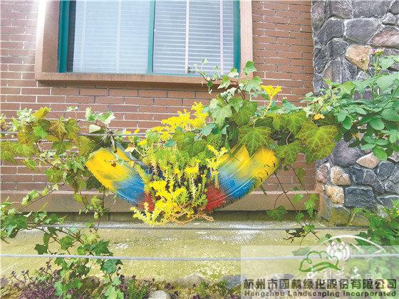 轮胎与佛甲草等植物搭配,营造特色景墙。