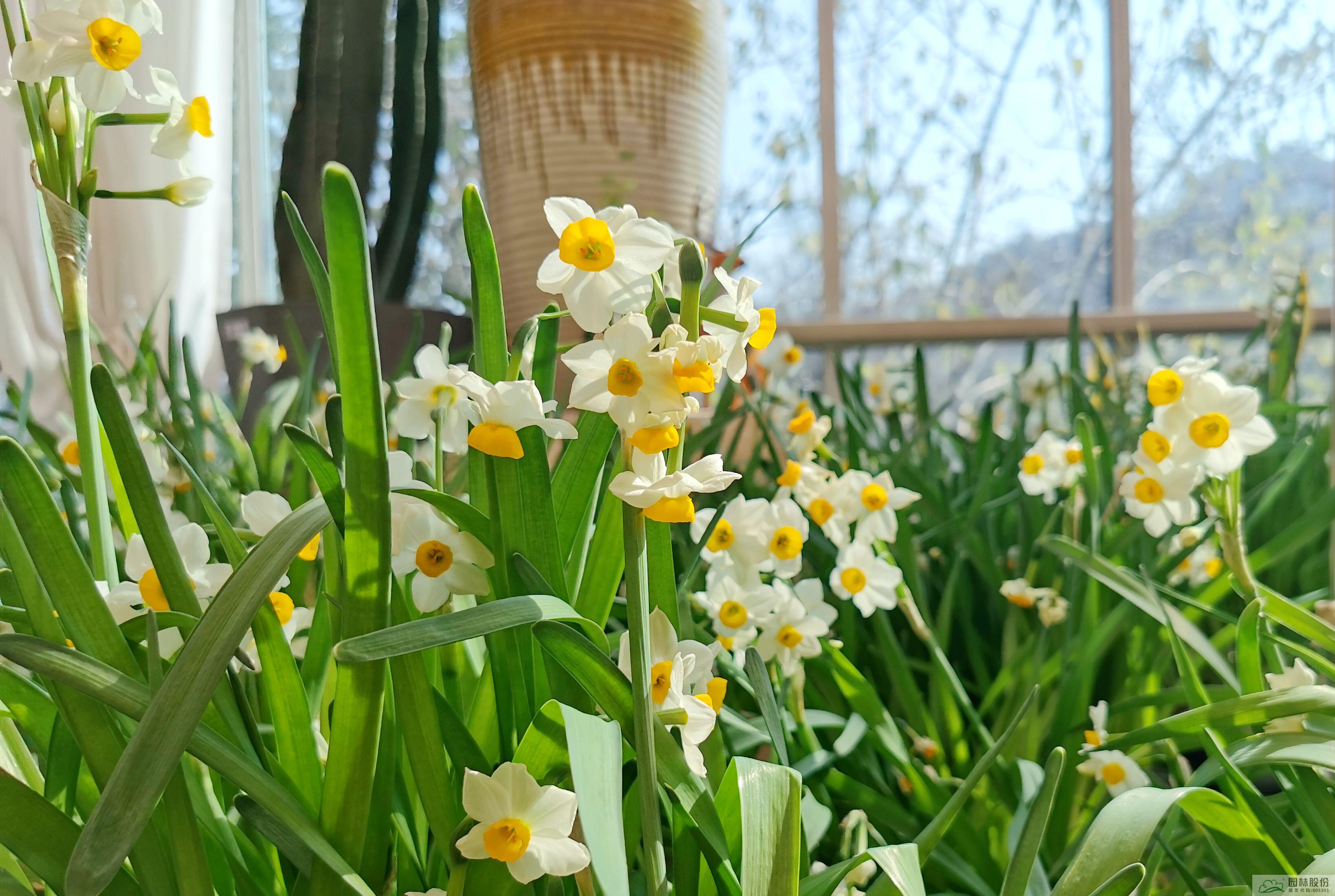 碧叶翠绿,绿的发光,花儿如白玉一般,清香高雅的水仙