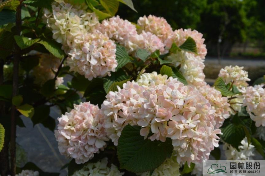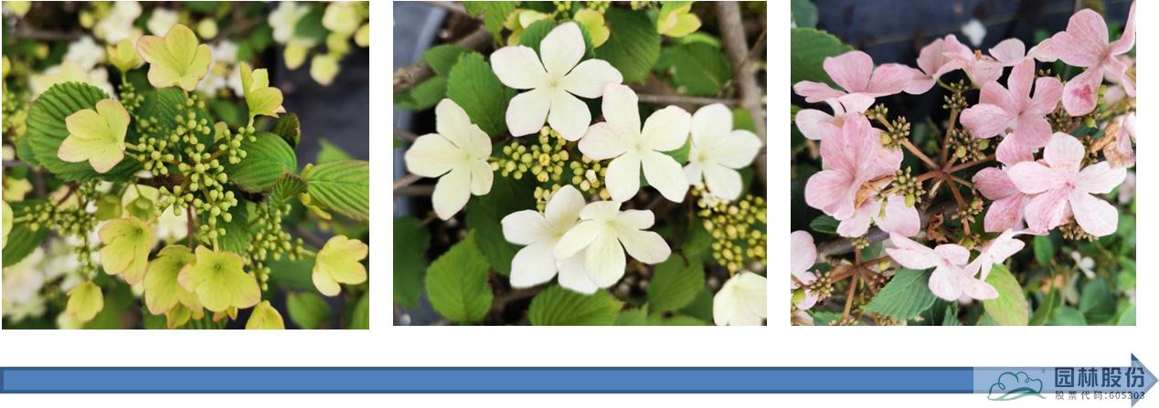 忍冬科荚蒾属,落叶灌木,日本引进,株高可达2.5-3m。新叶成暗红色,后呈绿色,秋色叶颜色多变。整个花序都是不育花,球形,花苞粉绿色,开放后淡粉色,最后变成白色。它适应我国大部分地区种植,生长相对缓慢,适合园艺盆栽或庭院观赏。