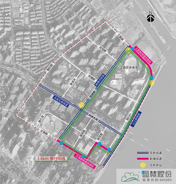 设计策略:将红线范围内现有绿道,通过微改造,整合串联现有慢行步道、沿河绿道、沿江绿道,形成3.6km的慢行环线,并纳入杭州绿道地图中。丰富人群出行方式和体验,提升多路径可达性。