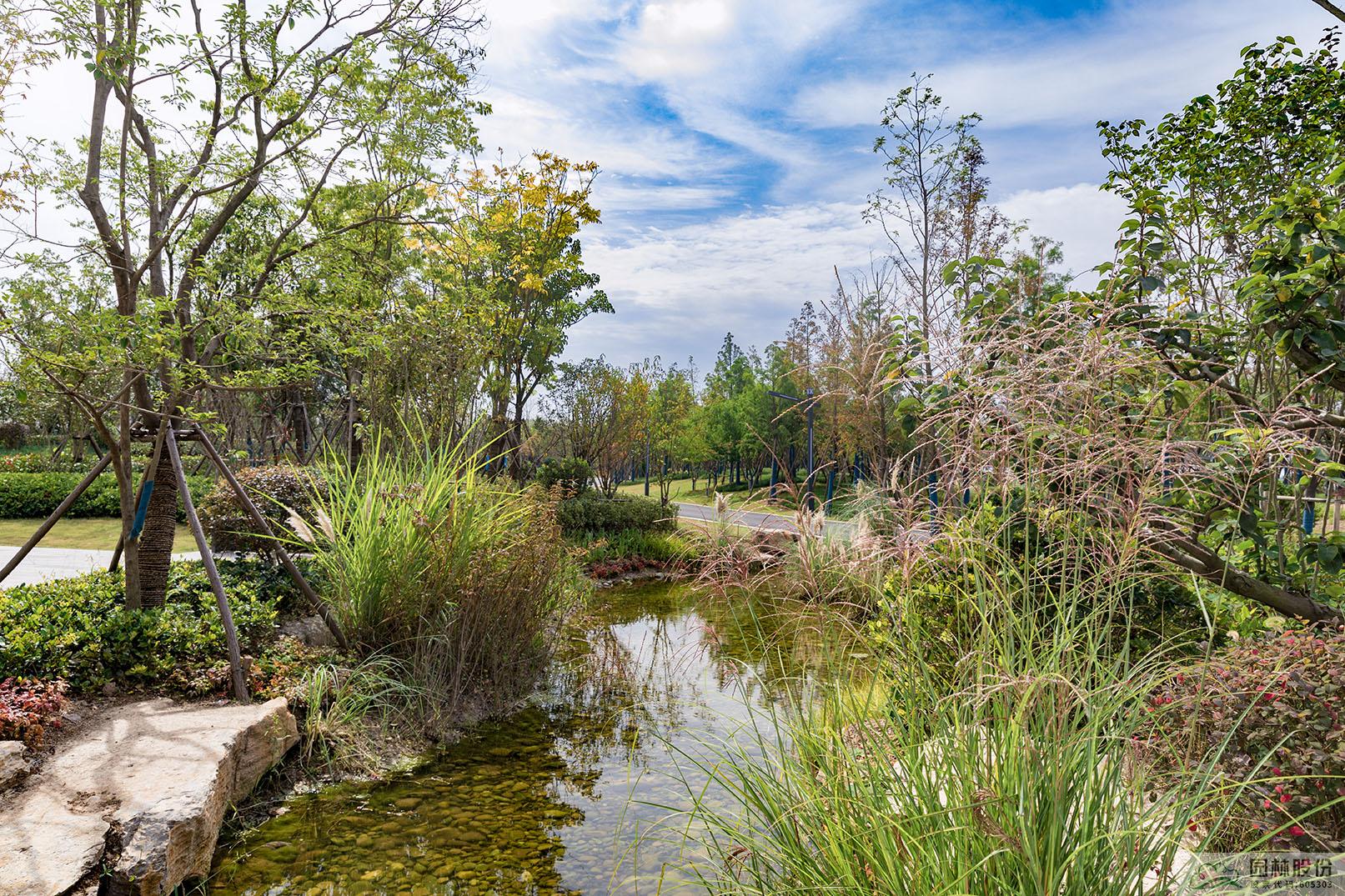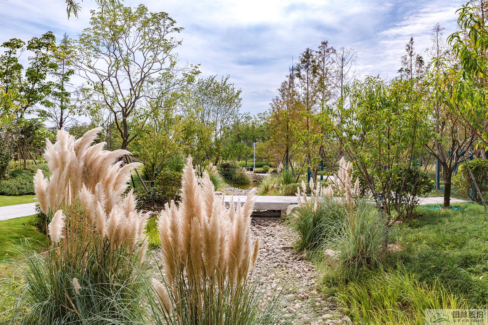 旱溪景观同样是海绵城市理念的应用典范,下雨时蓄水,既可用于植物的日常浇灌,又能营造出清新灵动的水景;干旱时,铺满鹅卵石的水底又可与周边丰富的植物营造出另一种园林意境。
