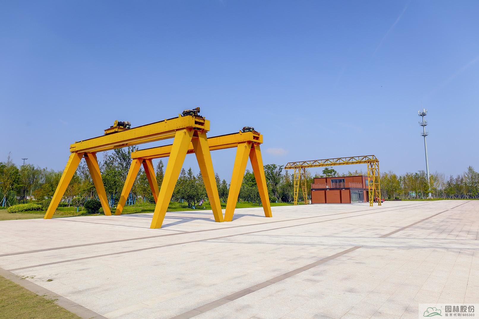 为了再现这些历史文化,公园内设计了许多关于运河历史文化的景观小品。入口处的主题雕塑,高10米、宽15米,抽象概括了运河形象,展现宿迁深厚的历史文化和运河文化。石柱简洁大气,寓意宿迁城市的基石,下方由紫铜锻造的水纹造型,代表宿迁的运河和古黄河交融贯通,展现这两条历史悠久的河流对宿迁人民生活及城市发展起到的重要意义,也由此拉开公园的序曲,一路向东,铺展开一幅千年运河文化的生动画卷。