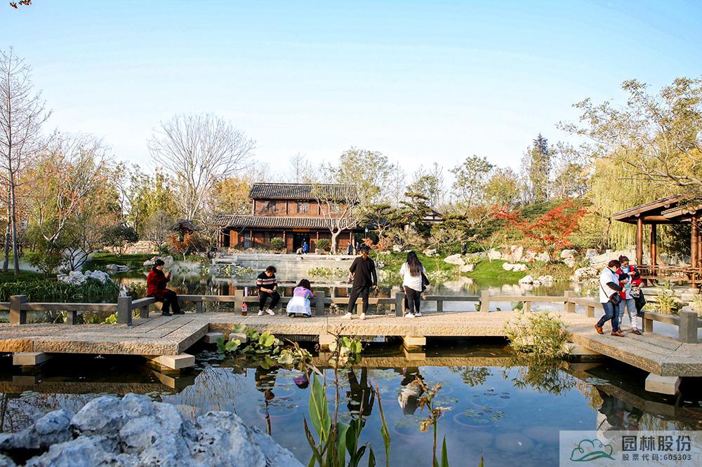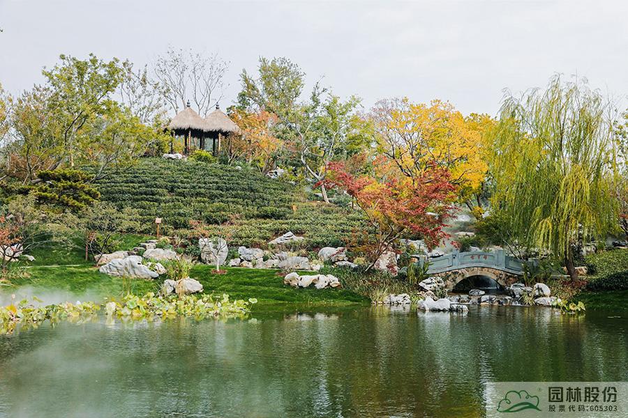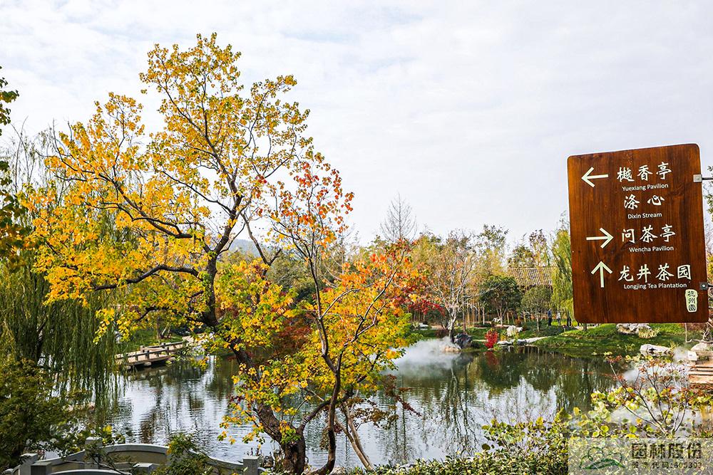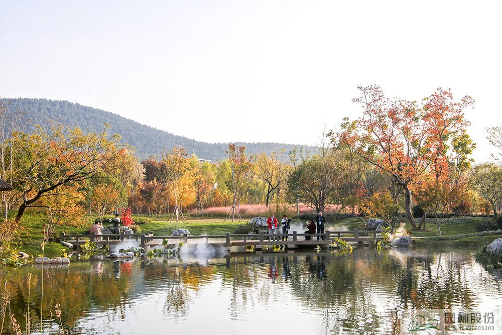 契合展区主题的樾香亭临湖而立,双坡屋面,八柱敞亭,柱子上书五言联“鱼乐人亦乐,泉清心共清”,尽显悠闲舒适的情趣。在亭内凭栏而坐,侧耳听风雨,迎风嗅花香。抬头远望,荷叶亭亭的水面上,有鱼儿在水中嬉戏;曲折的长桥上,游人在漫步观景;水岸边,银杏、三角枫、乌桕等色彩缤纷,编织出一幅深秋的美丽画卷。