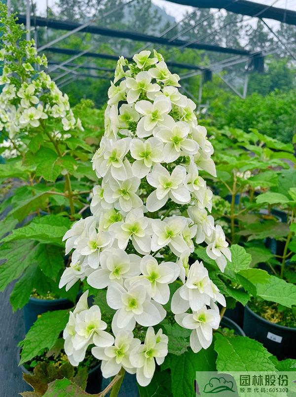 虎耳草科绣球属,落叶灌木;叶片栎形,长宽接近,3~7 裂;花期 5-10 月,圆锥花序,重瓣,规则排列成一个宝塔状,花穗长度可达 30~40 cm,花初开为绿白色,后变为雪白色,再然后渐变为粉红色,到秋冬颜色则会变为锈红色,其花瓣颜色及质地也是很好的干花材料;老枝开花,花后修剪,平时只需修剪重叠枝、病残枝即可;耐热耐寒,喜温暖、荫蔽、湿润的环境,微酸性土壤;植株健壮,枝条挺拔,花球硕大,叶片肥厚,秋季叶色变为深红色或青铜色,可夏观花,秋赏叶,是一种优良的花园花境植物。