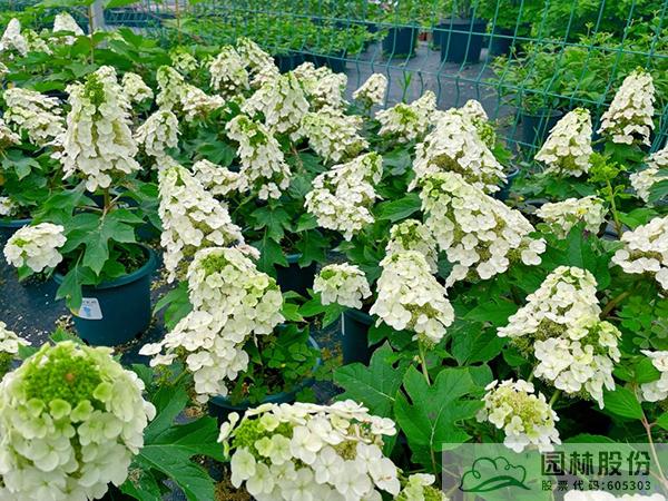 虎耳草科绣球属,落叶灌木;‘冰雪皇后’植株高大,可达到近两米的高度,枝条紧凑,叶形独特,深裂,质感略粗糙,长18~20 cm,橡木状深绿色,秋季变成迷人的酒红色、栗色或紫色;细长圆锥形花簇,长30 cm左右,随着季节推移,大部分白色不孕花会逐渐变成粉红色,花期长,从春末一直持续到夏季;适应性强,在夏季强光照射下,植株长势健壮,优越的密集花簇和强壮的直立茎干十分适合装饰花园。