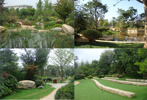 昆明市市级党政机关办公用房搬迁建设项目区内景观绿化工程(第三标段),地处昆明市呈贡县吴家营乡小尖山西北附近,总面积101800㎡,工程包括硬质景观、绿化种植和水电工程,为大型综合性园林景观工程。绿轴D组团内的人工湖的施工,清香木、黄连木和山楂等特型树的应用,自然石汀步、老石板园路等生态型游步道的铺装,成为工程中最大的特色和亮点。漫步在林荫小道上,呼吸着清新的空气,聆听着涓涓的流水声,一幅绿意盎然、闲适惬意的生动画卷带给人们更多关于自然的完美体验!