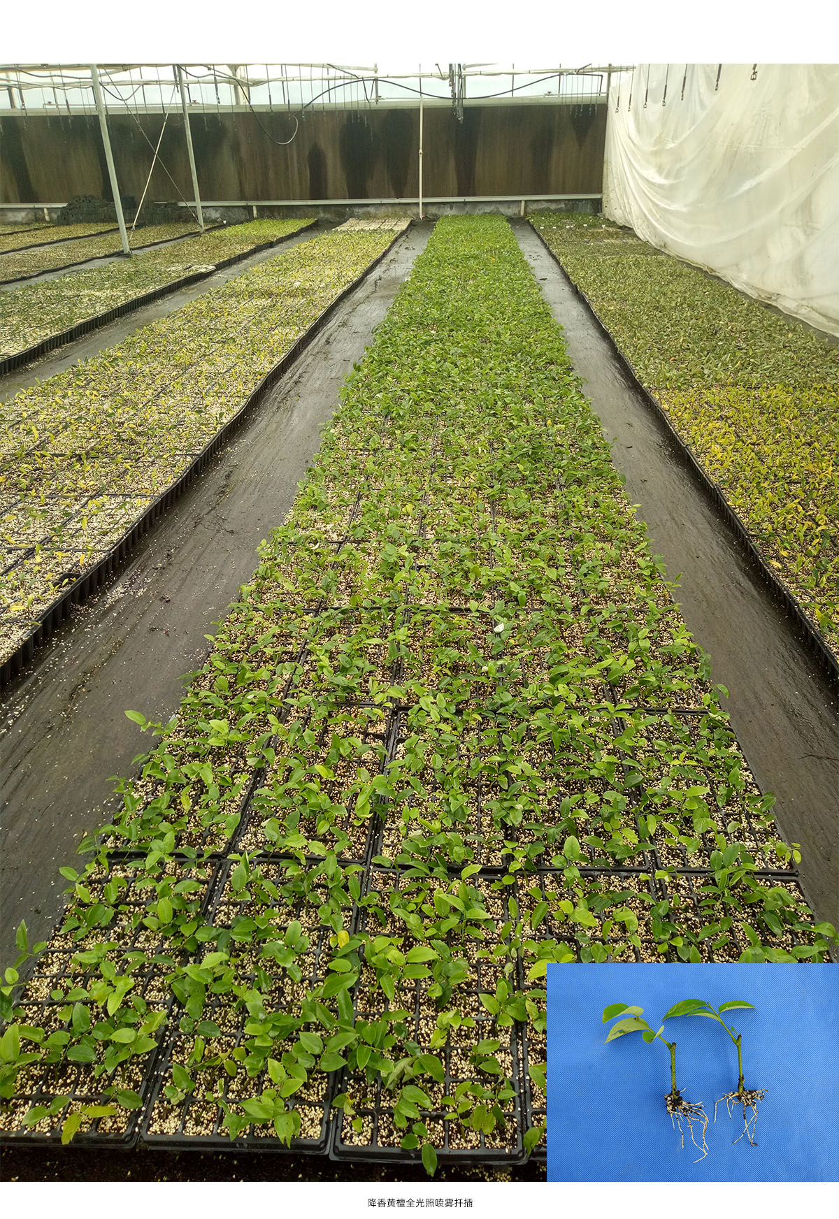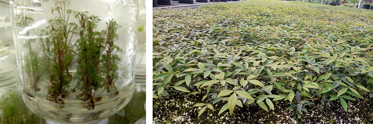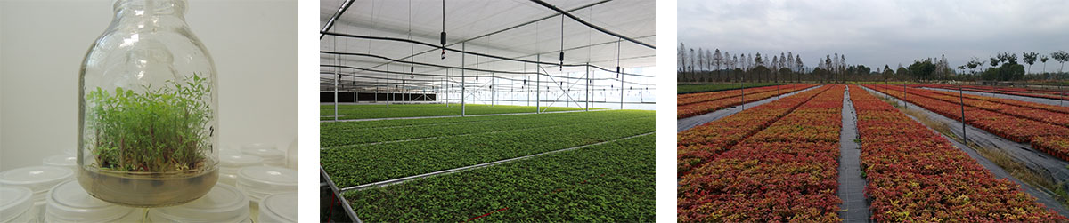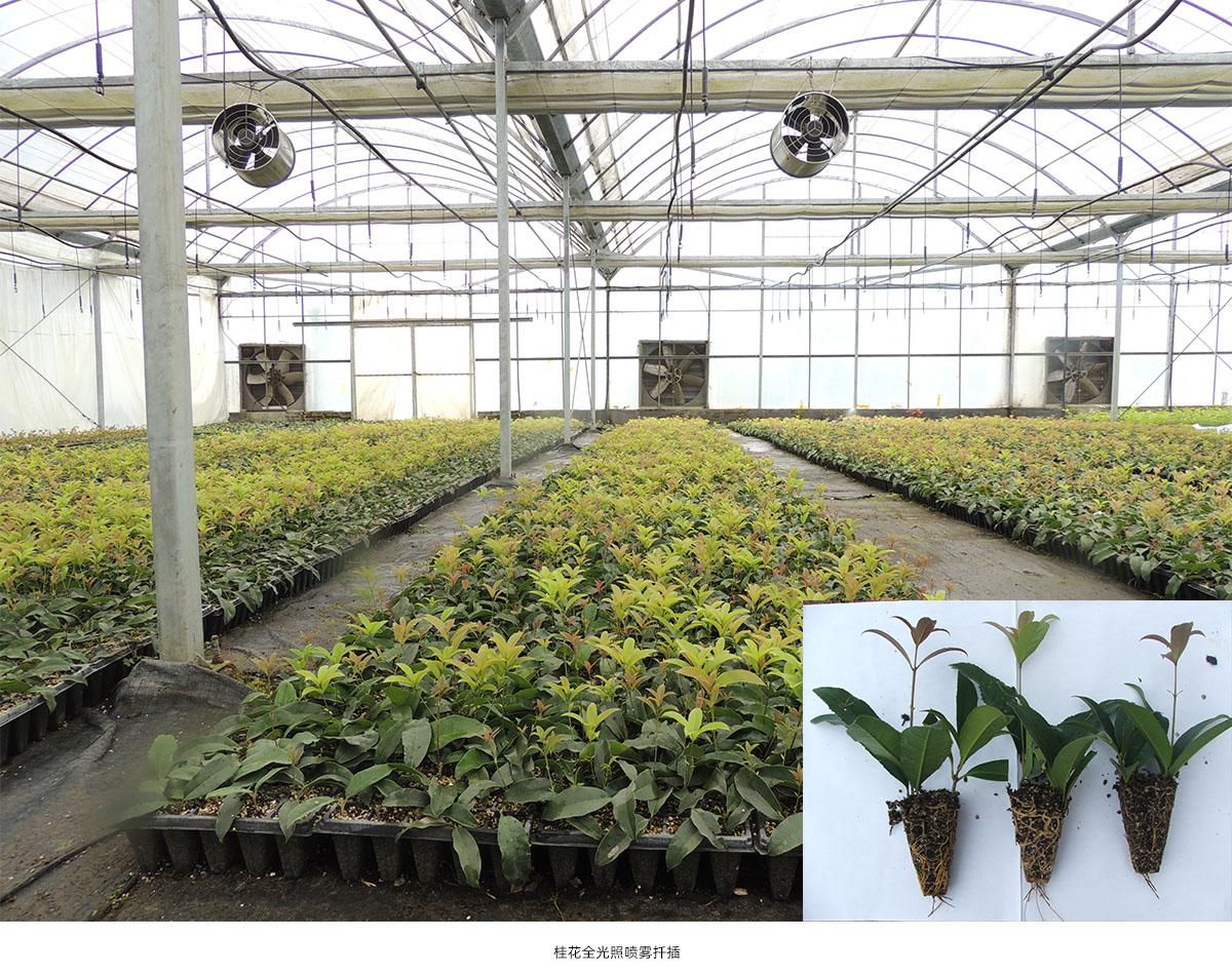 (1)全光照喷雾扦插育苗技术 全光照喷雾扦插技术具有生根期短、成活率高和操作简单等优点。研究院已建立了桂花、冬青、降香黄檀、新优宿根植物等数百种植物的全光照喷雾扦插技术体系,年度育苗量200多万。